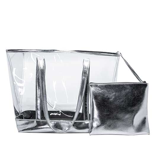 Le sac de plage transparent est accompagné d'une pochette assortie aux anses argentées pour y glisser les objets qui ne seront ainsi pas en contact de l'eau ou du sable.