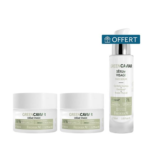 Find our GREEN CAVIAR cream duo:The Green Caviar face cream with a creamy texture nourishes the skin intensely. Composed of exceptional ingredients such as green caviar, organic rose muscat oil and organic Centella Asiatica extract, your skin regains its softness. It is smoothed and plumped.