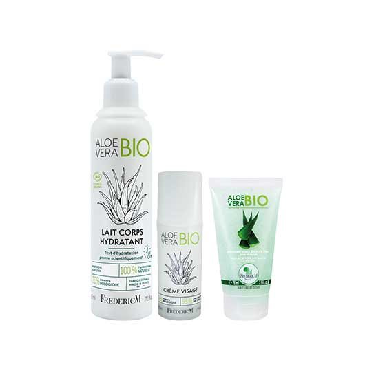 This set includes an aloe vera face cream with 95% natural ingredients. An aloe vera milk that will hydrate and nourish your skin for a long time, as well as a gentle exfoliant with aloe vera, delicately scented, gently eliminating dead cells.