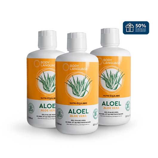 Aloel est spécialement formulé à base de Gel d’Aloe Vera Biologique (87%), de Miel et de Nectar d’Agave. Ce complément alimentaire contribue à développer une sensation de bien-être général, de tonus et d’équilibre au quotidien.