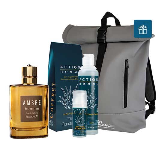 Coffret Action Homme, deux produits indispensables de l'homme actif, la douche se fait énergique et vivifiante avec le shampooing corps cheveux deux-en-un ! Les actifs du soin visage Action 3 hydratent et aident à apaiser les sensations d'inconfort liées au rasage. Peau énergisée et vivifiée ! Choisissez son parfum préféré Ambre pour plus de personnalisation, un aromatique oriental parfait comme cadeau de Noël !