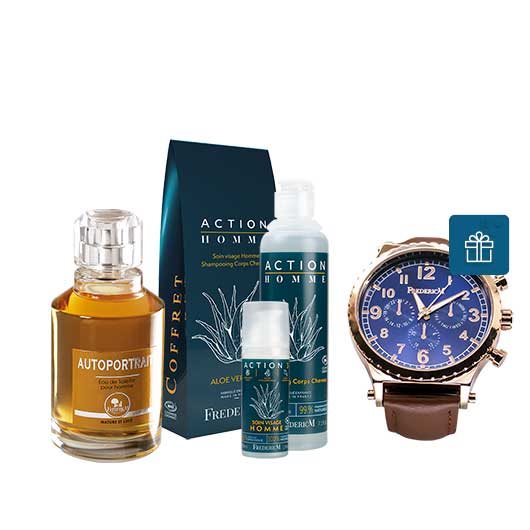Pour lui faire plaisir ! Notre coffret Action Homme, deux produits indispensables de l'homme actif, la douche se fait énergique et vivifiante avec le shampooing corps cheveux deux-en-un ! Les actifs du soin visage Action 3 hydratent et aident à apaiser les sensations d'inconfort liées au rasage. Peau énergisée et vivifiée ! Pour une offre complète et personnalisée, choisissez son parfum Autoportrait, accents frais et toniques. Montre homme d'une valeur de 35 € incluse !