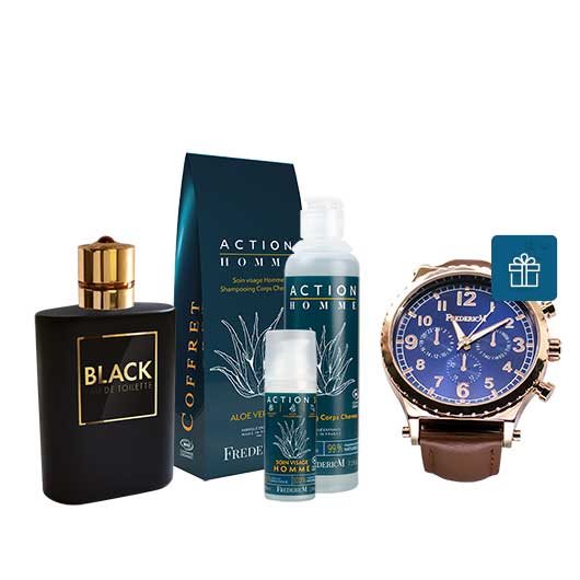 Pour lui faire plaisir ! Notre coffret Action Homme, deux produits indispensables de l'homme actif, la douche se fait énergique et vivifiante avec le shampooing corps cheveux deux-en-un ! Les actifs du soin visage Action 3 hydratent et aident à apaiser les sensations d'inconfort liées au rasage. Peau énergisée et vivifiée ! Pour une offre complète et personnalisée, choisissez son parfum préféré Black, hespéridé boisé. Montre homme d'une valeur de 35 € incluse !