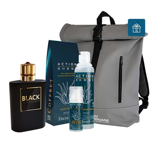 Coffret Action Homme, deux produits indispensables de l'homme actif, la douche se fait énergique et vivifiante avec le shampooing corps cheveux deux-en-un ! Les actifs du soin visage Action 3 hydratent et aident à apaiser les sensations d'inconfort liées au rasage. Peau énergisée et vivifiée ! Choisissez son parfum préféré Black pour plus de personnalisation, hespéridé boisé, parfait comme cadeau de Noël !