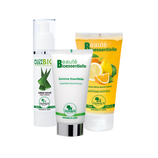 Cette offre comprend une crème visage aloe vera (AVB02), une gomme essentielle (GBE06) et d'un masque detox visage (GBE22)