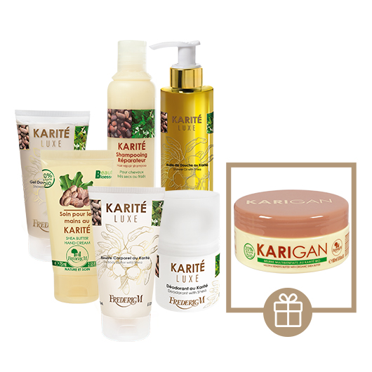 Cette sélection contient : Gel douche karité luxe 150 ml - Body butter karité luxe 150 ml - Huile de douche karité luxe 190 ml + Déodorant a bille karité luxe 50 ml + Shampooing réparateur Karité + Soin pour les mains Karité + OFFERT : Karigan- beurre multibienfaits au karité 150 ml