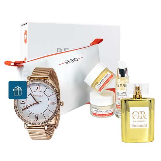 Choisissez votre parfum préféré Une Vie en Or, délicat chypré fleuri, il est assorti dans cette offre à votre nouvelle routine Bebio ! Composée de notre crème de jour Absolue Boost et notre crème de nuit Absolue Lift aux actifs 100 % naturels ! Elles sont accompagnés du sérum Hyaluro 2, pour une action complète de soin ! Une réponse globale anti-âge pour lutter contre les signes de vieillissement cutané. Effet garanti, daons son coffret Beauté Absolue !