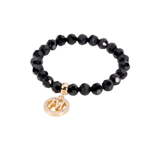 Black pearl bracelet adorned with a golden FREDERIC M pendant.
