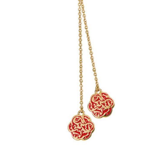 Collier doré avec chaine tour de cou et deux fleurs dorées et colorées descendant dans le décolleté.
