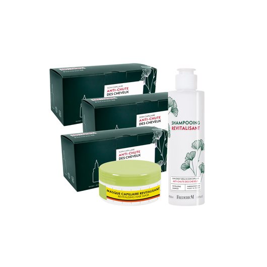 Les ampoules anti-chute freinent la perte de cheveux et relancent le processus de croissance. Le masque capillaire revitalisant contient deux ingrédients naturels reconnus pour leurs exceptionnelles vertus régénérantes pour le cuir chevelu. C'est l’allié idéal pour une revitalisation régulière de votre cuir chevelu. Le shampooing revitalisant est un complément idéal du soin capillaire anti-chute et il aide le cheveu à retrouver toute sa vitalité et un toucher soyeux.