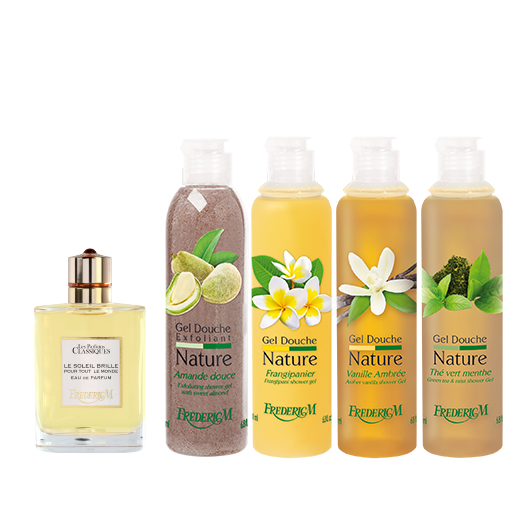 Cette offre est composée de 4 gels douche (exfoliant amande douce, frangipanier, vanille, the vert menthe) et du sac cabas; Bénéficiez du parfum Soleil Brille, une composition radieuse et fraiche citron jasmin.