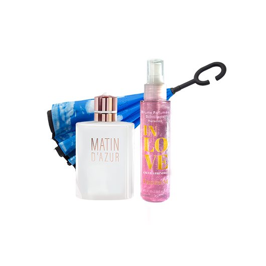 Les doux rayons d’un soleil chaud de coco et de fleur d’oranger apparaissent sur la riviera … La Vanille et le musc dans son sillage vous enveloppent de leur chaleur et révèlent votre pouvoir de séduction, solaire et lumineux comme un matin d’Azur. Sublimez et illuminez votre peau grâce à notre brume pailletée pour le corps assortie à notre nouveau parfum IN LOVE. Des notes fleuries et fruitées qui vous envelopperont d’un cocon de douceur. Notre parapluie réversible bleu ciel sera votre allié en cas de journée pluvieuse.