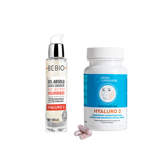 Une double action agissant en synergie de l’intérieur et de l’extérieur. Skin Live est une véritable cure de jeunesse pour votre peau. Le double effet de l’acide hyaluronique et du collagène vous apporte une réponse adaptée aux besoins de votre peau. HALURO 2 favorise le renouvellement cellulaire et l'hydratation cutanée. BEBIO le gel absolu double concentré aux acides hyaluroniques, hydrate, repulpe l’épiderme et améliore l’élasticité de la peau.