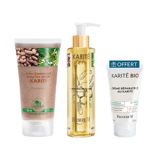 Exfoliante para Pies - Karité - 150 ml + Aceite de Ducha Karité Luxe 190 ml + Crema Reparadora de Pies con Karité