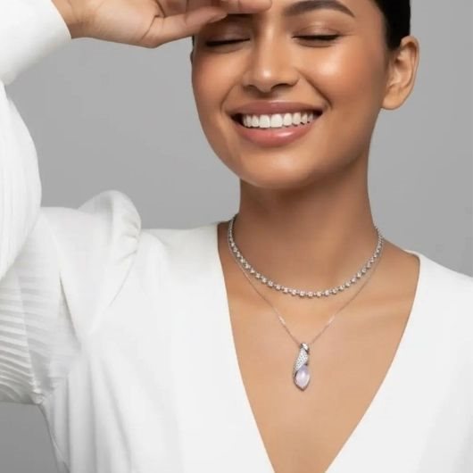 Уход за таким колье с родиевым покрытием, фианитами и стеклом прост и помогает сохранить блеск надолго.