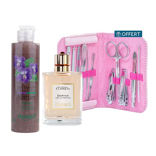 Eau de Parfum 'DORYAN' + Gel de Ducha Exfoliante Violeta + Set de Manicura Bicolor para Mujer